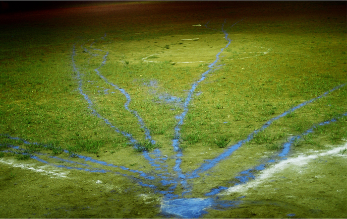 Dibujo sobre parque de pelota, después un juego, los jugadores dibujan de memoria el trayecto de la bola durante la entrada mas importante del partido, Vega Alta, Puerto Rico.